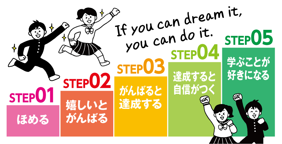私たちは定期テストの点数アップや志望校合格のためだけではなく、「学ぶことの楽しさ」を知り、「夢の実現のため」に努力を惜しまず、「達成することによる自信」を身に着け、将来社会で活躍できる有意な人間に育ってほしい、との思いで指導にあたっています。
